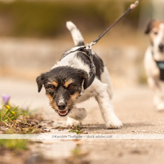 Das bedeutet, kommt Ihnen ein Hund links zu ihrem Hund entgegen, dann lassen Sie ihn auf der rechten „ungefährlichen“ Seite laufen und umgekehrt. So stehen Sie quasi zwischen Ihrem und dem fremden Hund und entspannen damit die Situation.