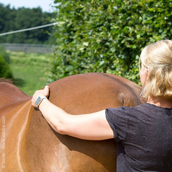 Streichen Sie mit der flachen Hand von der Gurtlage etwa 30 Zentimeter nach hinten und wiederholen Sie das mit mittlerem Druck und unter Einsatz deiner Fingernägel. Hierbei sollte Ihr Pferd den Rücken anheben. Wenn nicht, dann kann das auf blockierte Gelenke der Lenden- oder Brustwirbelsäule hindeuten. Auch Entzündungen oder Arthrosen an der Wirbelsäule sowie Verspannungen an Rücken-, Brust- oder Trapezmuskel können ursächlich sein.