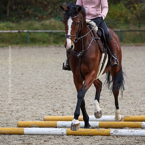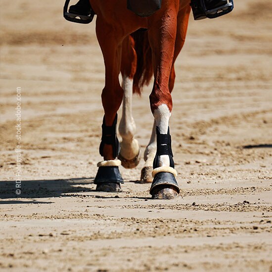 Um die Beweglichkeit der Hinterhand zu testen, führen Sie bei dieser Übung Ihr Pferd ca. fünf Minuten im Schritt ganze Bahn. Achten Sie darauf, wie weit es mit den Hinterhufen übertritt. Ideal ist es, wenn Ihr Pferd mit den Hinterbeinen in die Spur der Vorderbeine tritt oder etwa eine Hufbreite drüber. Wenn Ihr Pferd die ganze Zeit kurze Schritte macht, ist es möglicherweise nicht ausreichend beweglich in der Hüfte, dem Knie oder dem Sprunggelenk.