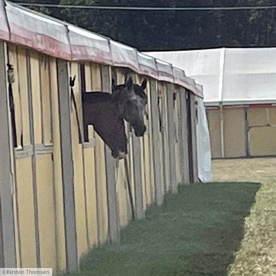 Am Mittwoch werden nach der 6-stündigen Reise und dem Vetcheck die Stallzelte bezogen. An dem Anreisetag werden sie locker geritten und zum Grasen geführt. Unser Jockey Jan reiste diesmal mit 5 Pferden an. Ein Springpferd, zwei 5-jährige und zwei 6-jährige Geländepferde. Ein ganz schön strammes Programm für einen Reiter! Er muss sich auf diesem Turnier immerhin diverse Dressuren, Geländekurse und Springparcours ansehen und merken und nebenher noch seine 5 Pferde reiten und top vorstellen. Ein gutes Helferteam im Hintergrund ist daher sehr wichtig. Die Pferde werden bestens versorgt, schick gemacht und der Reiter kann sich nur auf sein Reiten konzentrieren.