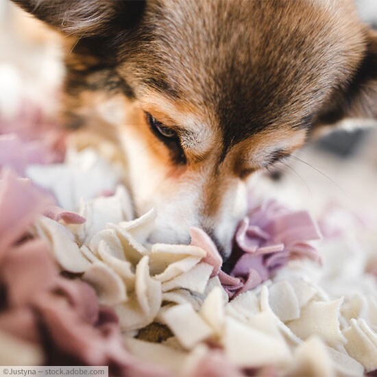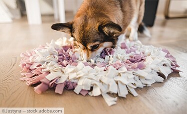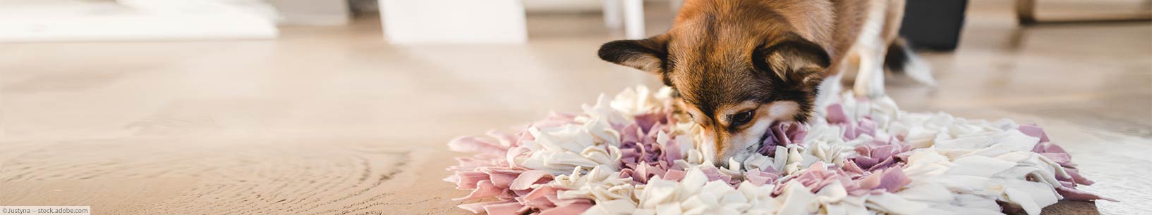 Einfach einige Leckerlis oder Trockenfutter zwischen den Fransen verstecken. Bei den ersten Schnüffelversuchen empfiehlt es sich dabei zu bleiben, wenn Ihr Vierbeiner sich auf die Suche macht. Nicht, dass er vor lauter Eifer noch den Teppich zerlegt!