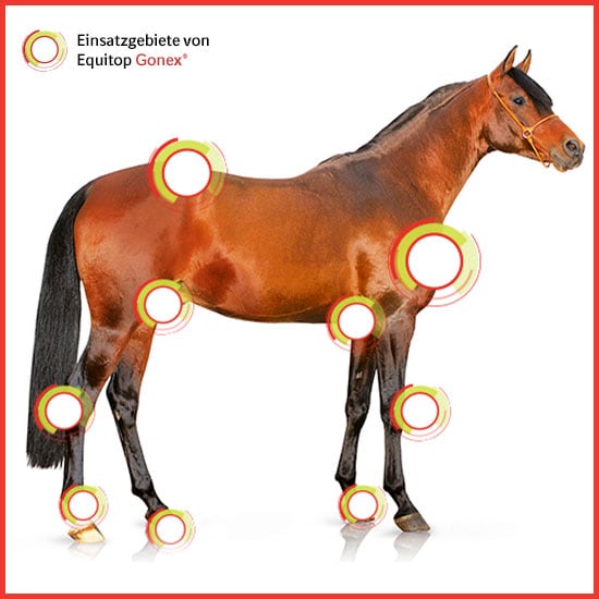 Equitop Gonex® stellt essenzielle Bausteine für den Gelenk- und Bindegewebsstoffwechsel (Gelenkschmiere, Bänder, Sehnen, und Knorpel) bereit (u. a. Glykogen-Komplexe, langkettige Fettsäuren und Glucosaminglykane). Durch gezielte Bereitstellung von Nährstoffen können Entzündungsmediatoren beeinflusst werden. Darüber hinaus verbessert sich die Mikrozirkulation (Durchblutung) und sorgt für die bestmögliche Nährstoffversorgung von Gelenkschmiere, Knorpel und dem darunterliegenden Knochen. Durch die rein natürlichen Inhaltsstoffe belastet Gonex® den Organismus nicht und ist hervorragend verträglich. So können Sie Equitop Gonex® Ihrem Pferd täglich zufüttern.