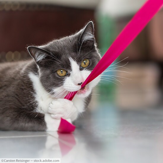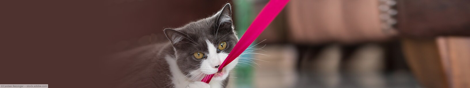 Grundsätzlich eignen sich Geschenkbänder, Katzenangeln, Bindfäden oder auch Gummibänder als tolles Spielzeug für Katzen. Insbesondere bei Wohnungskatzen sorgen die Fangspiele für einen tollen Ausgleich und mehr Bewegung. Jedoch sollten Sie darauf achten, Ihre Katze niemals unbeobachtet mit einem Faden spielen zu lassen. Besser noch: Halten Sie das eine Ende fest in der Hand, denn nur so können Sie das Verschlucken des Fadens vermeiden.