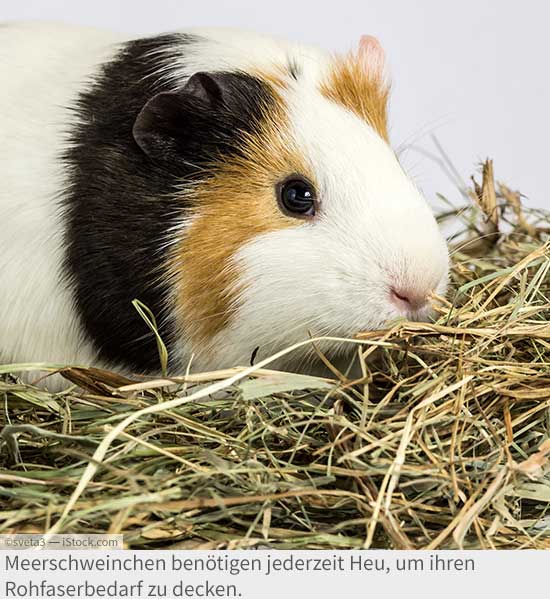 Die Verdauungsorgane des Meerschweinchens sind besonders empfindlich. Um ihren hohen Energieumsatz aufrechterhalten zu können, nehmen Meerschweinchen innerhalb von 24 Stunden bis zu 100 kleine Futterportionen zu sich. Daher ist die häufigere Fütterung kleinerer Mahlzeiten der einmal täglichen Fütterung einer großen Ration vorzuziehen.