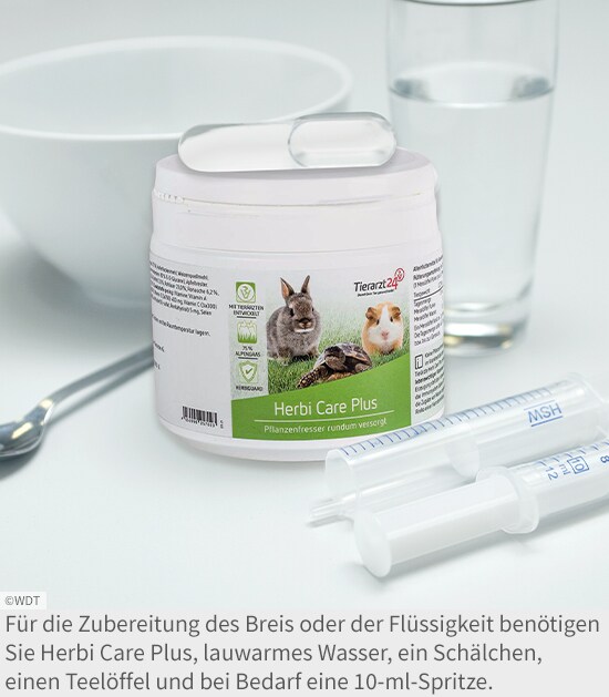 Das Alleinfuttermittel wird mit Wasser zu einem Brei oder einer Flüssigkeit angerührt. Dies hat die Vorteile, dass die Heimtiere das Futter freiwillig aufnehmen können, Sie die Flüssigkeit aber auch mit einer Spritze ins Maul eingeben können, falls sie die Futteraufnahme vollständig verweigern. Ziel ist es, dass die Tiere möglichst rasch wieder eigenständig ein für sie geeignetes Futter aufnehmen. Besonders geschwächten Meerschweinchen sollten Sie (während der Aktivitätsphasen) alle 2 bis 3 Stunden kleine Mengen Herbi Care Plus anbieten oder verabreichen.