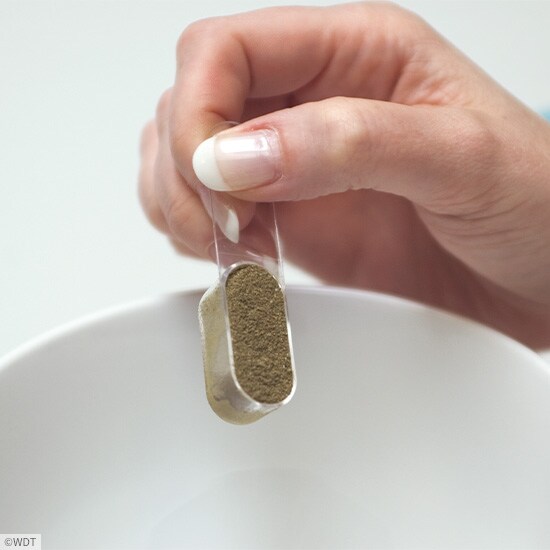 - Füllen Sie die empfohlene Menge des Pulvers mithilfe des Messlöffels in das Schälchen. Fügen Sie nun die angegebene Menge lauwarmen Wassers hinzu.