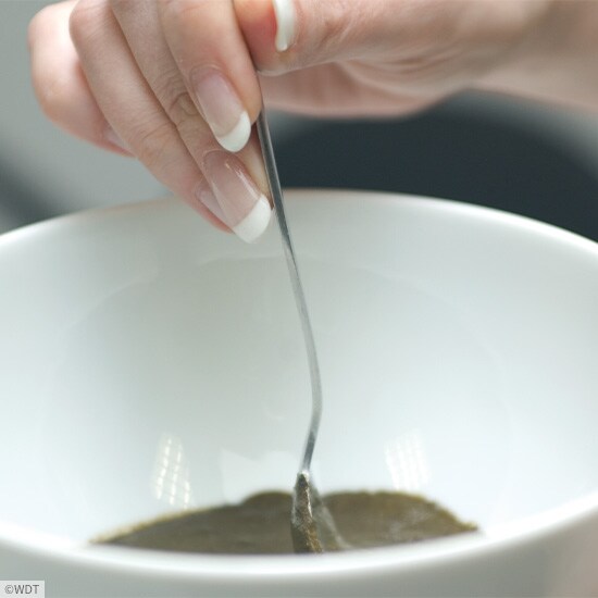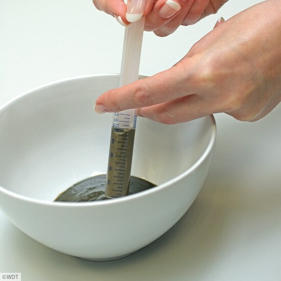 - Vermischen Sie das Wasser mit dem Pulver zu einem zähflüssigen Brei. Ist er zu fest, können Sie einige Tropfen Wasser hinzufügen, um den Brei zu verdünnen. Ist die Lösung zu flüssig, geben Sie ein wenig Pulver hinzu, um die Konsistenz zu festigen.