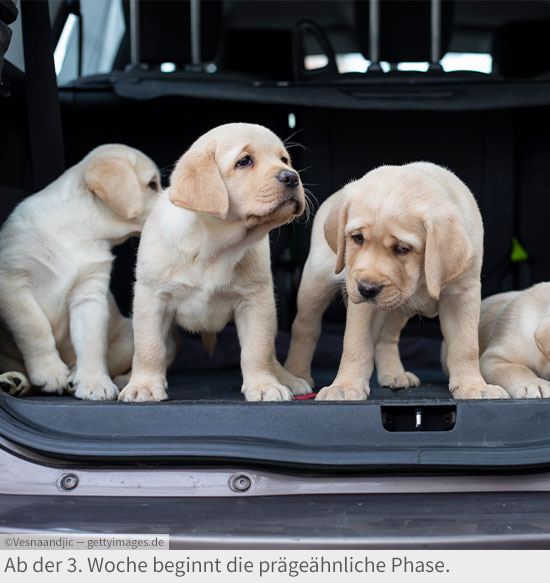 Ab ca. dem 21. Tag beginnt die Phase der Zuwendung zur Außenwelt: Alle Eindrücke, die der Welpe in der belebten (Sozialisation) und unbelebten Umwelt (Habituation) in dieser Zeit erlebt, werden so fest in seiner „Wohlfühlgarnitur“ verankert, dass man von einer prägeähnlichen Phase spricht.