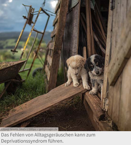 Andernfalls sprechen wir von einem „Deprivationssyndrom“: Ein solcher Welpe ist in einer reizarmen Umgebung aufgewachsen und hat viele Alltagsgeräusche und -situationen nicht kennengelernt bzw. hat sich nicht daran gewöhnen können. Am Ausdrucksverhalten des Welpen sieht man deutlich, dass er allgemein ängstlich-nervös oder auch übermäßig aggressiv ist.