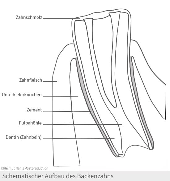 Die Backenzähne des Pferdes stehen innerhalb einer Zahnreihe lückenlos nebeneinander. Die Kauflächen befinden sich jedoch nicht auf einer Ebene. Im kaudalen (hinteren) Bereich steigt die Zahnreihe auf Höhe der letzten drei Backenzähne an. Dies muss der Tierarzt bei der Untersuchung der Maulhöhle beachten, da er sonst versehentlich die Pulpahöhle des Zahnes eröffnet und den Zahnnerv freilegt. Bei der Pulpahöhle handelt es sich um einen Hohlraum im Inneren des Zahnes, die den Nerv (Pulpa) enthält. Wer sich die Backenzähne des Pferdes näher anshaut erkennt Querrinnen und Querkämme auf ihrer Kaufläche.