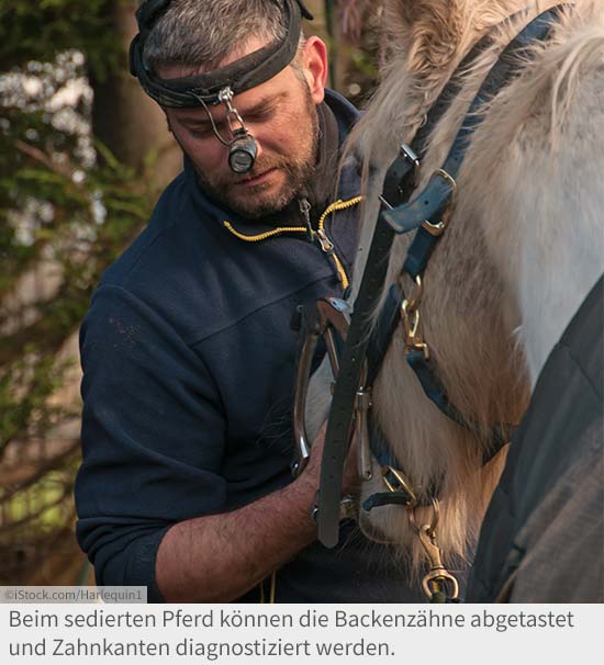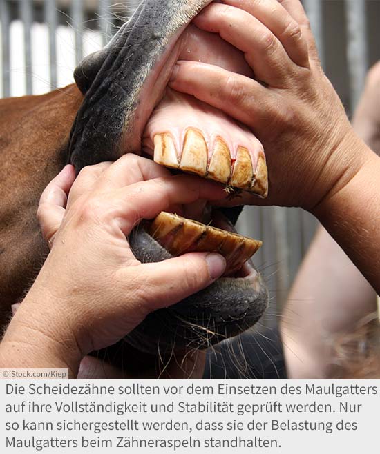 Die Untersuchung und Therapie der Zahnfehlstellungen erfordert zunächst eine Sedation des Pferdes. Erst dann kann das Maulgatter angelegt und die Untersuchung und Behandlung der Zähne unter Sichtkontrolle erfolgen. Zahnhaken und -kanten können nur mithilfe des Maulgatters gewissenhaft geschliffen werden. Die Kauflächen der Backenzähne werden dabei nicht bearbeitet, sondern nur geschliffen, wenn das Pferd beispielsweise einen Meißelzahn oder ein Treppengebiss aufweist.